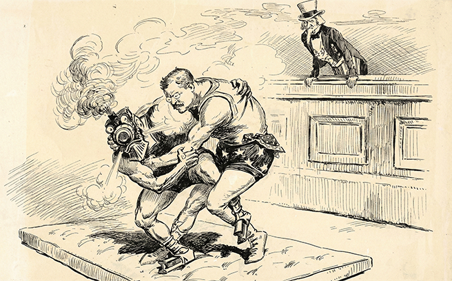 Bushnell, E. A. (1906). Jiu-jitsued [Political cartoon]. Cincinnati Post.