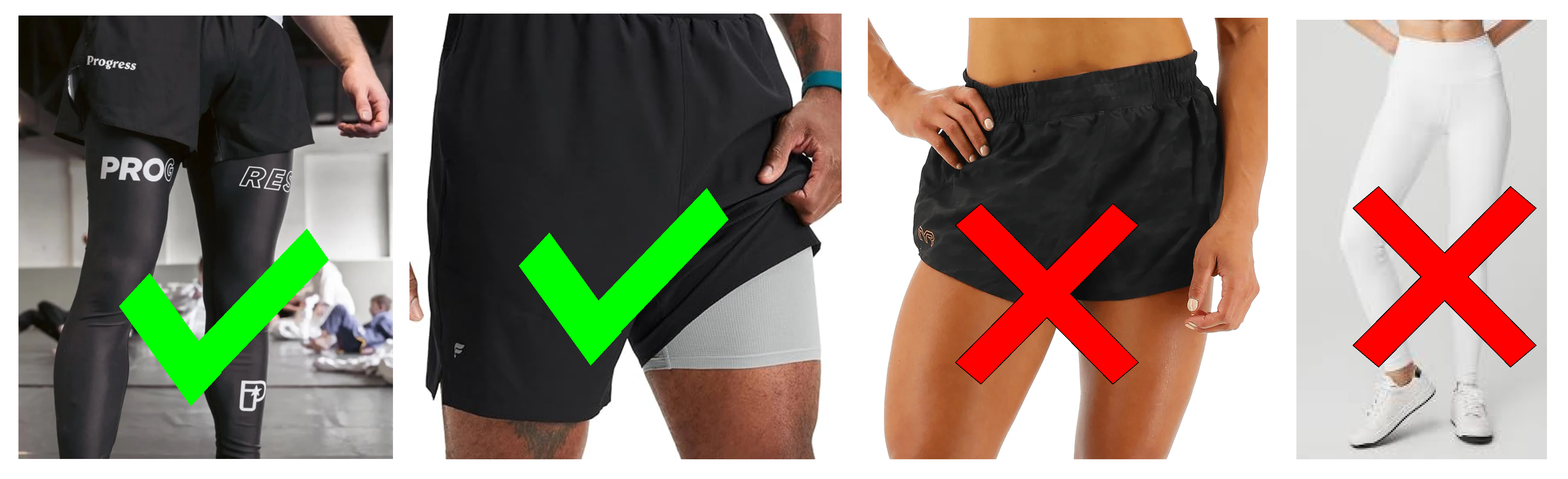 - Shorts alone are also appropriate; however, the groin area must remain fully covered while lying on your back. We recommend wearing mid-thigh briefs, spats, or yoga pants beneath the shorts.